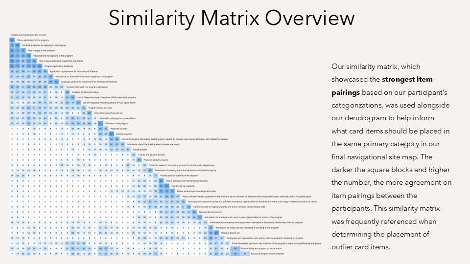 Using the Optimal Workship Similarity Matrix overview, we aimed to understand how participants grouped items and how that consequently informed our dendogram, and what this meant for our redesign.