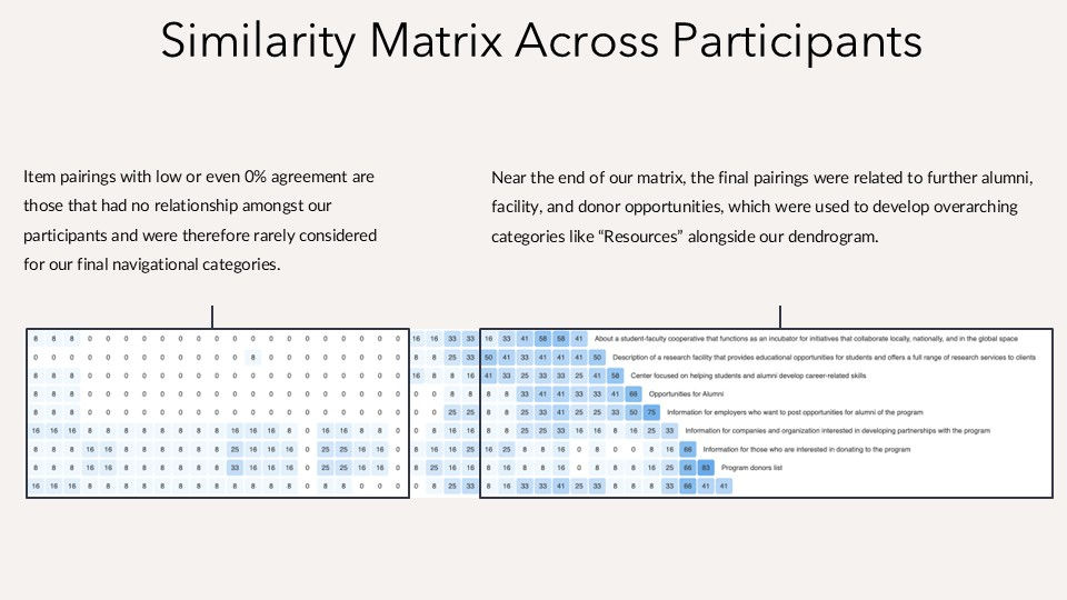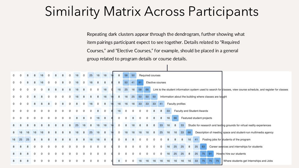 We used a similarity matrix to understand groupings and a dendrogram to visualize relationships for our redesign.