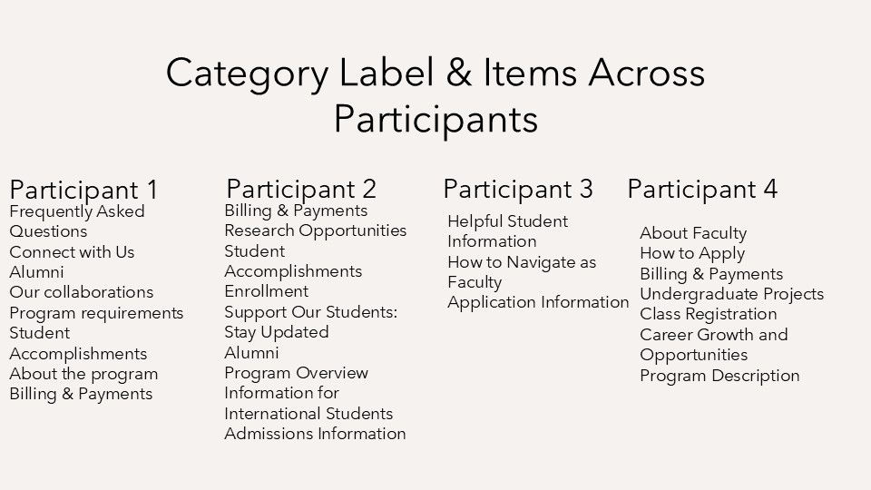 All the participants sorted their card items based on keywords like “program” or “application” which led to similar naming in the groups like “How to Apply”, Program Information”, “Billings & Payments”, etc.